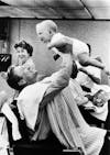 "Comes a time in every young man's life when he must get his first haircut," reads a caption that accompanied this 1956 photo, at top, of Kirk Douglas with his son Peter at the Beverly-Wilshire Health Club, where "Kirk keeps in trim for his rugged movie roles." Among those roles was the lead in "Spartacus," which included a 10,000-plus cast and crew, and a budget of more than $12 million, making it one of the most expensive films ever produced in Hollywood at that time. Photos, letters and other documents that Douglas donated to the Wisconsin Center for Film and Theater at the University of Wisconsin-Madison are now available online through a new Web site at www.whirld.com/wcftr/index.html. Used and distributed with permission by: UW-Madison University Communications 608/262-0067 Photo by: courtesy Wisconsin Center for Film and Theater Date: 1956 File#: file provided 10/07