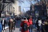 Student protesters walk, one holding a sign, "Power to the People...Our voices will be heard!"