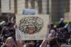 Protesters walk down Library Mall, one holding a sign, "No more silence"