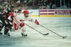 Forward Cassie Hall keeps the puck away from St. Cloud defenders during Wisconsin's 4-2 WCHA regular season title-clinching victory over the Huskies in LaBahn Arena on Sunday, Feb. 22, 2026.