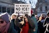 A protestor holds a sign saying "No kings! No ICE! No fear!" at the ICE Out March on Friday, Jan. 30, 2026.