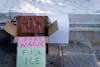 A box of handwarmers sits on the ground with signs saying "Take what you need Stay warm F*ck ICE" at the ICE Out March on Friday, Jan. 30, 2026.
