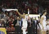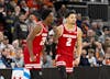 Nick Boyd and John Blackwell celebrate a score during the Wisconsin Badgers men's basketball team's 91-88 overtime victory over Illinois to advance to the semifinals of the Big Ten tournament on Friday, March 13, 2026.