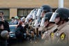 Illinois state police stand in a line at an anti-ICE protest outside the Broadview Detention Center in Broadview, Ill. on Oct. 11, 2025.