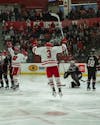 Captain Lacey Eden celebrates a goal in Wisconsin's 4-2 WCHA regular season title-clinching victory over St. Cloud State in LaBahn Arena on Sunday, Feb. 22, 2026.