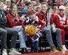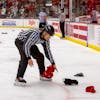 A referee collects hats thrown onto the ice after one of the two hat tricks in Wisconsin women's hockey's 9-2 demolition of St. Cloud State on Saturday, Feb. 21, 2026.