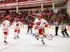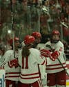 Wisconsin players celebrate a goal during Wisconsin women's hockey's 9-2 demolition of St. Cloud State on Saturday, Feb. 21, 2026.